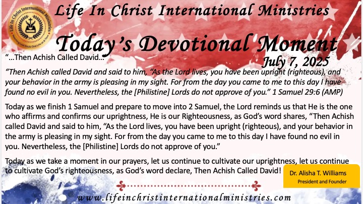 Today as we finish 1 Samuel and prepare to move into 2 Samuel, the Lord reminds us that He is the one who affirms and confirms our uprightness, He is our Righteousness, as God’s word shares, “Then Achish called David and said to him, “As the Lord lives, you have been upright (righteous), and your behavior in the army is pleasing in my sight. For from the day you came to me to this day I have found no evil in you. Nevertheless, the [Philistine] Lords do not approve of you.”