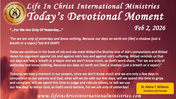 Today as we take a moment in our prayers, since we don’t know much and we are only a few days in comparison to our parents and God, what will we do with our few days, will we spend this time to gripe and complain, will we spend this time to judge and ridicule others, or will we use our few days to honor God, as God’s word declare, For we are only of yesterday!