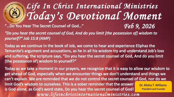 Today as we take a moment in our prayers, we recognize that it is easy to allow our wisdom to get ahead of God, especially when we encounter things we don’t understand and things we can’t explain. We are reminded that we do not control the secret counsel of God, nor do we limit God’s wisdom to ourselves. This is a sober reminder that the answer is always in God alone, as God’s word state, Do you hear the secret counsel of God!
